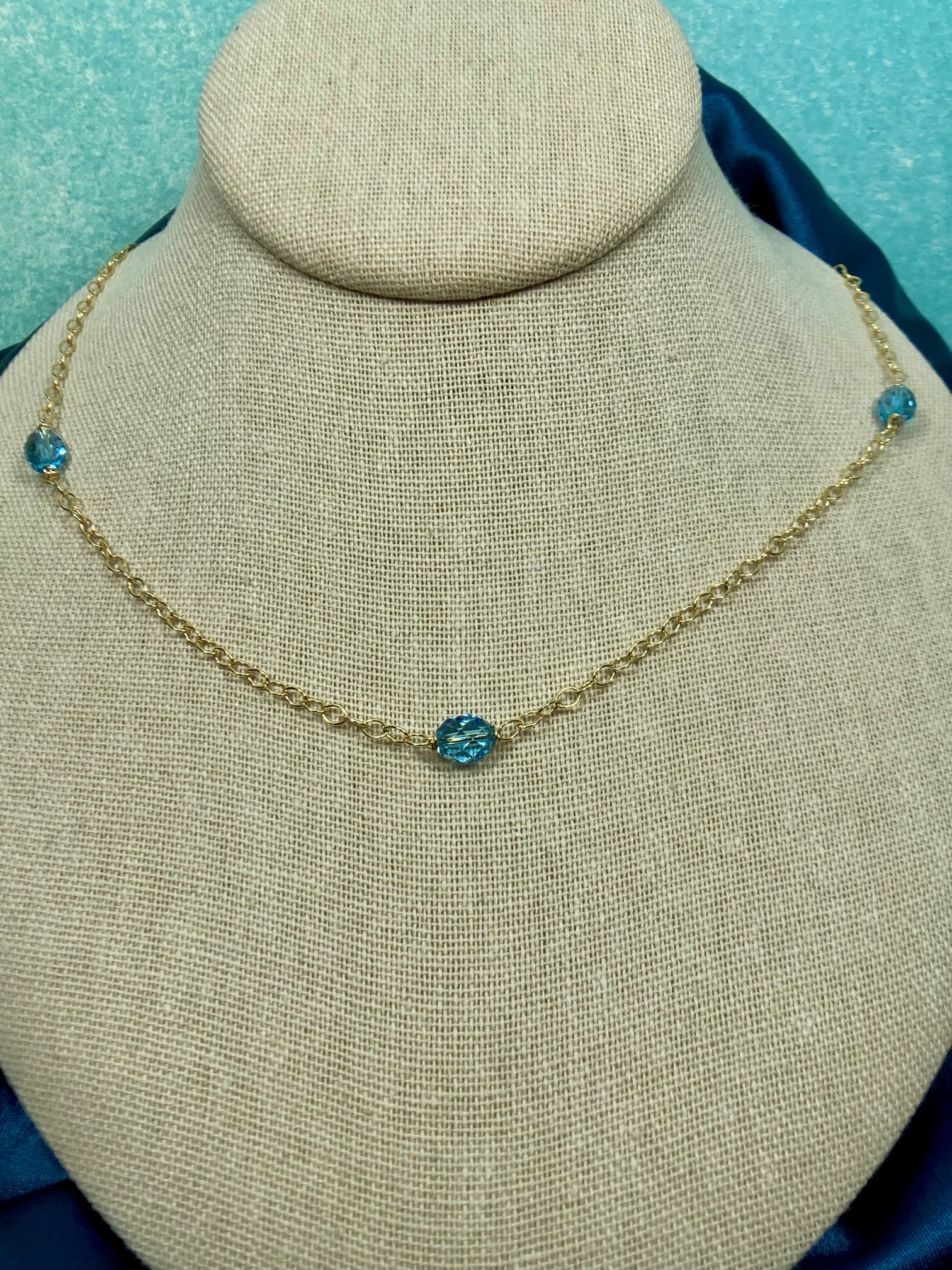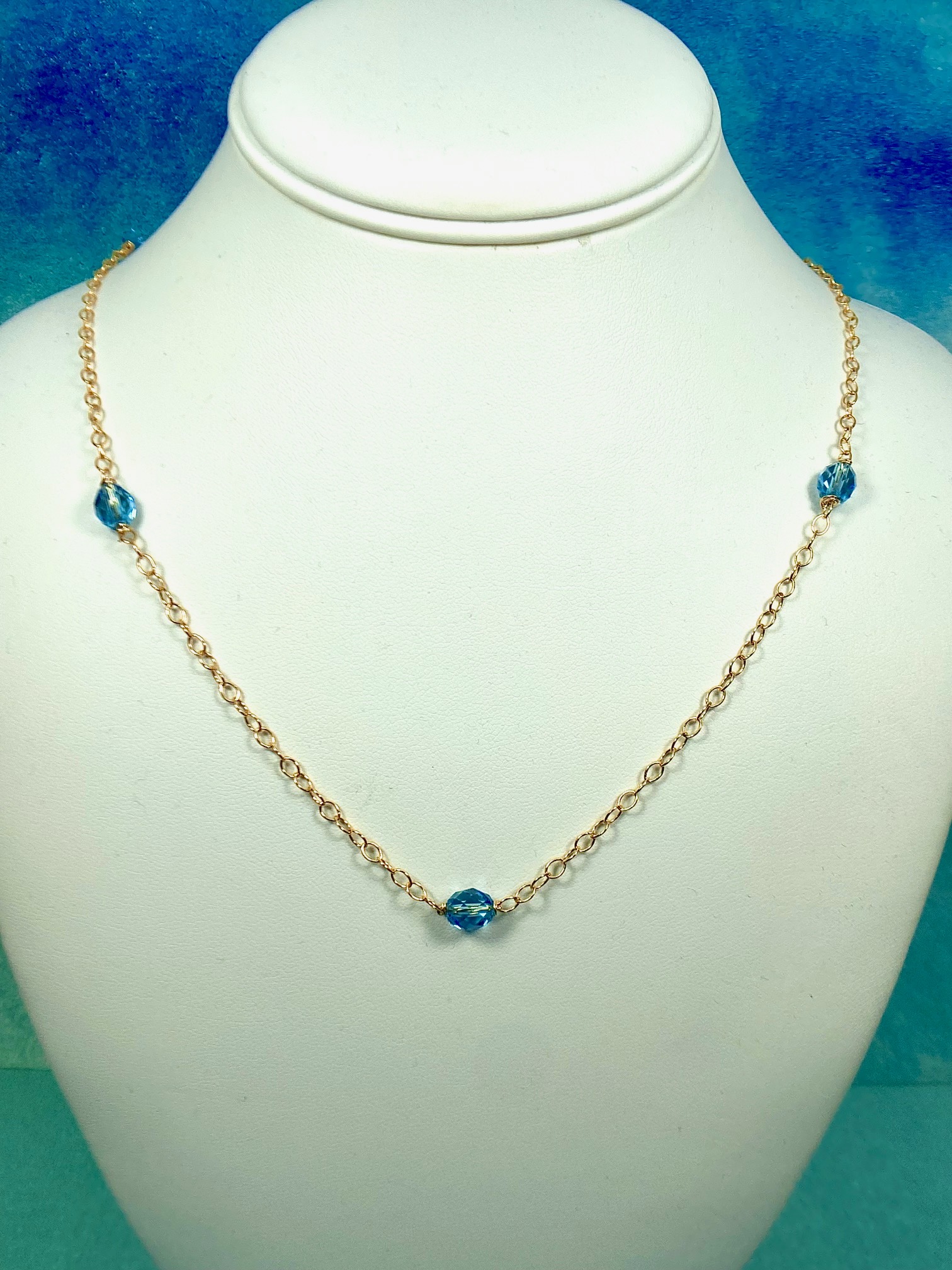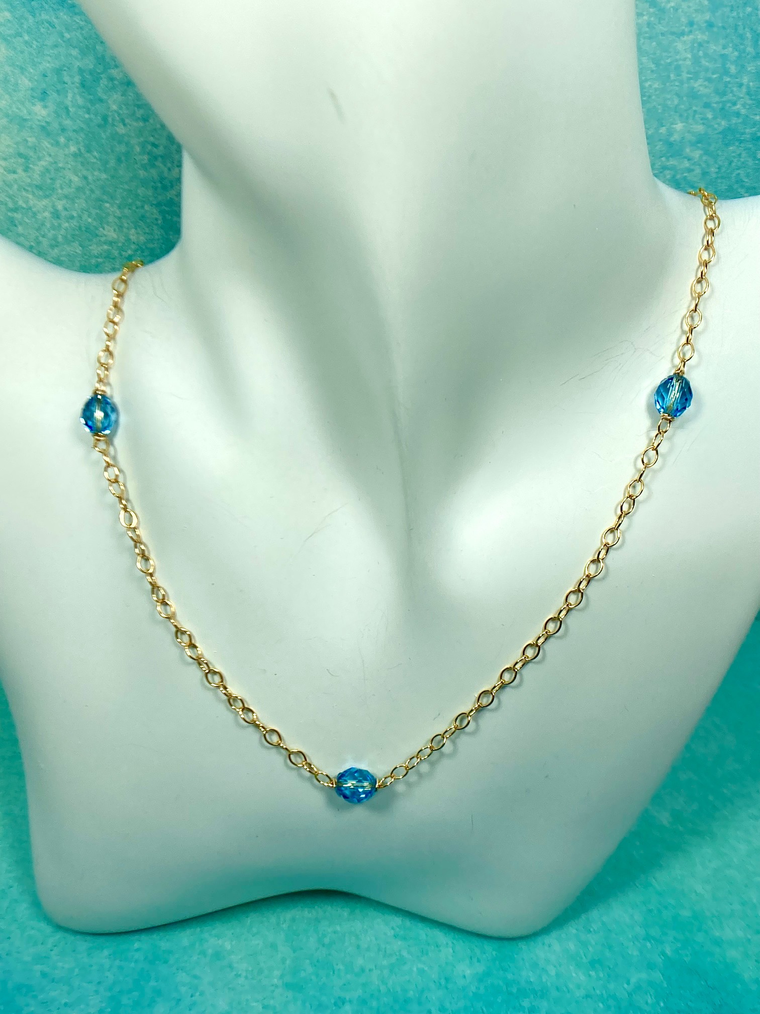 14KGF cable chain necklace with Austrian Crystal beads in Medium Blue. Necklace is 22 length. Crystal beads are 6mm. Clasp is lobster claw style.