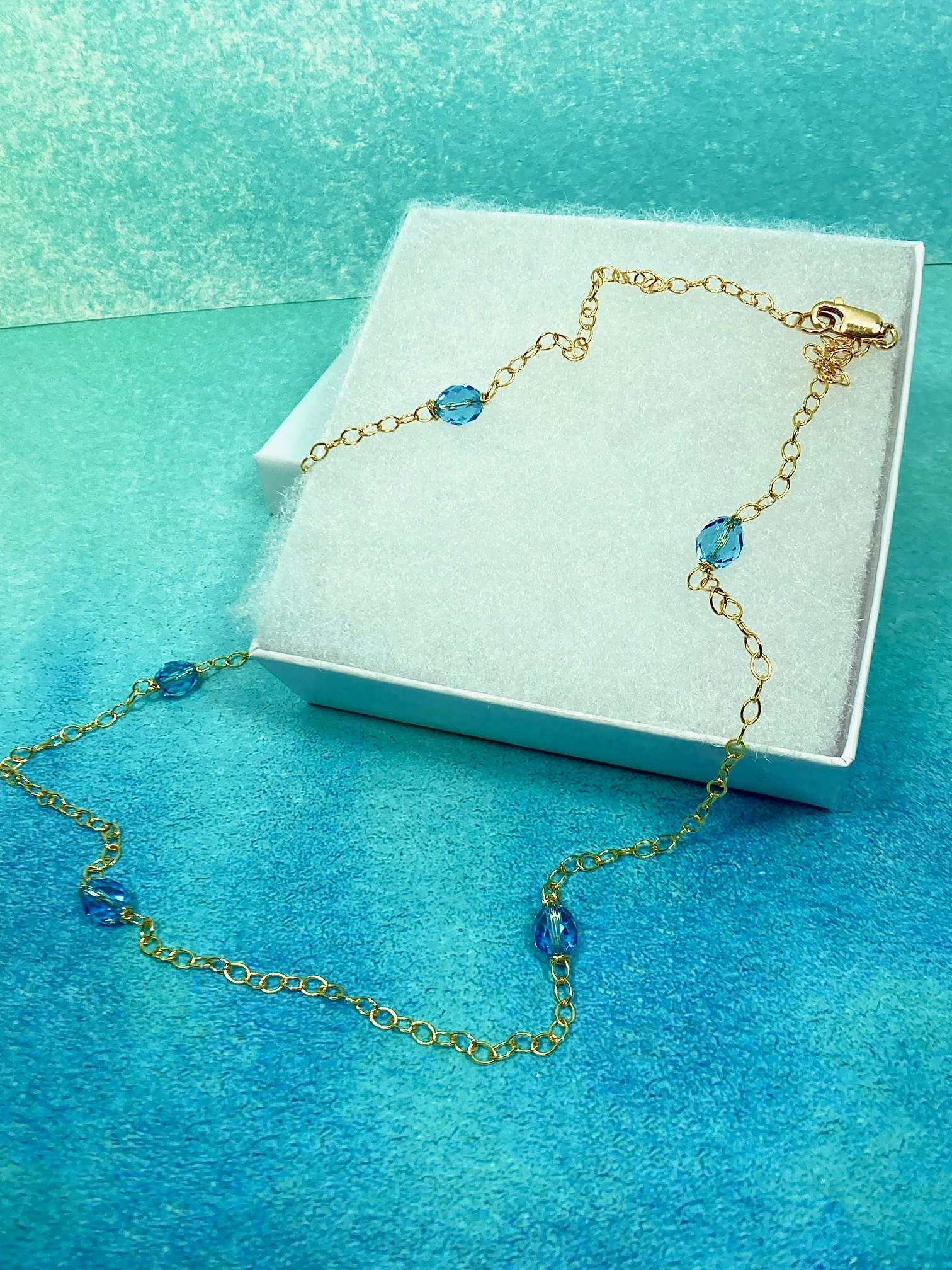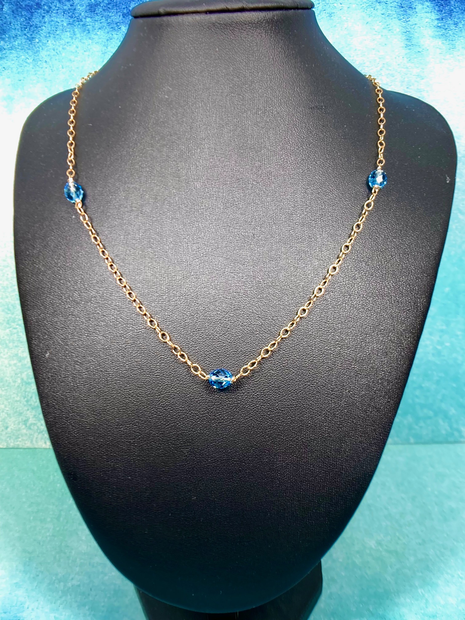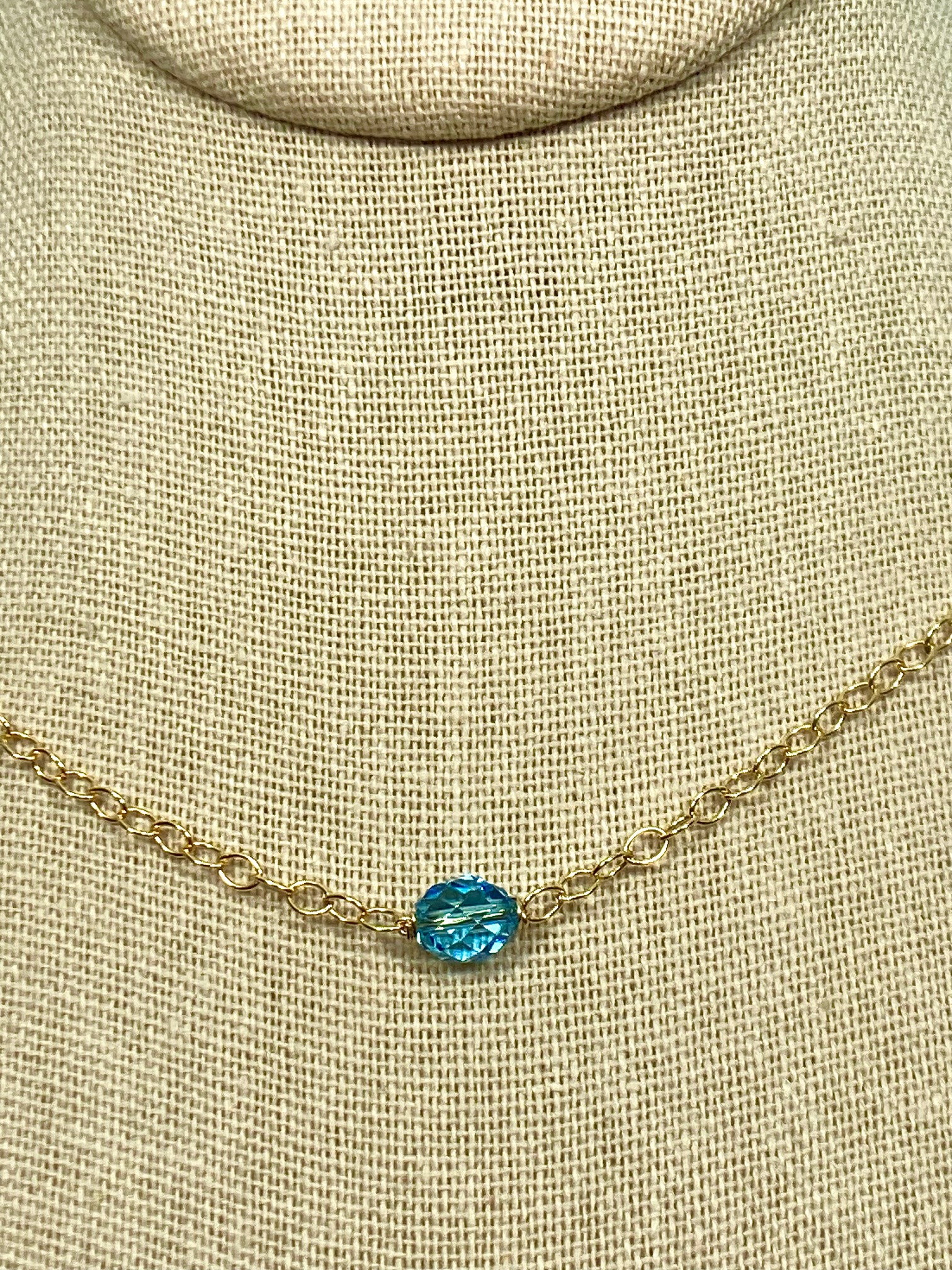 14KGF cable chain necklace with Austrian Crystal beads in Medium Blue. Necklace is 22 length. Crystal beads are 6mm. Clasp is lobster claw style.