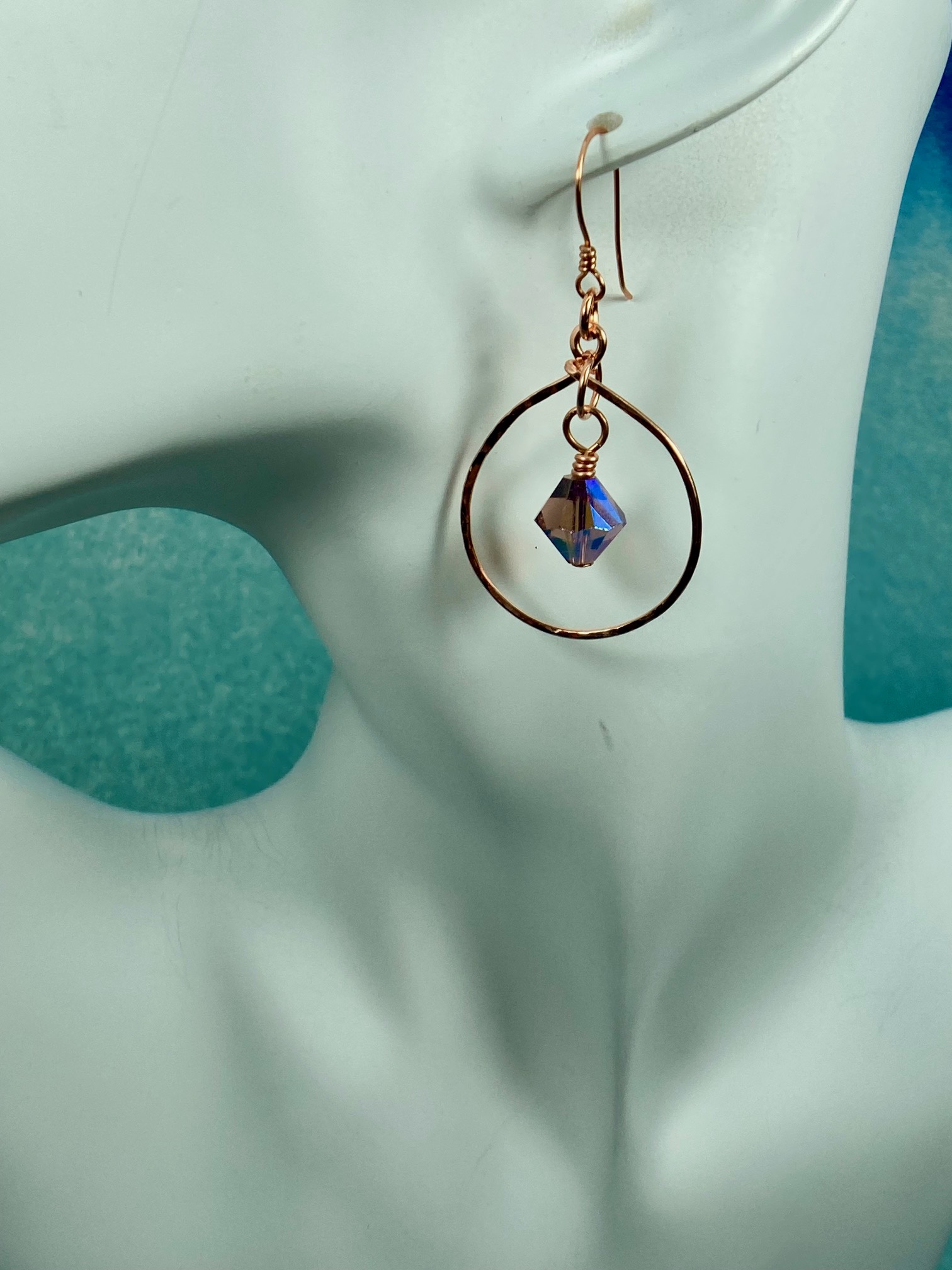 18 gauge Copper Circle earrings with amethyst AB colored Bicones. Earwires are 22 gauge French hook style. Circles have a hammered finish.