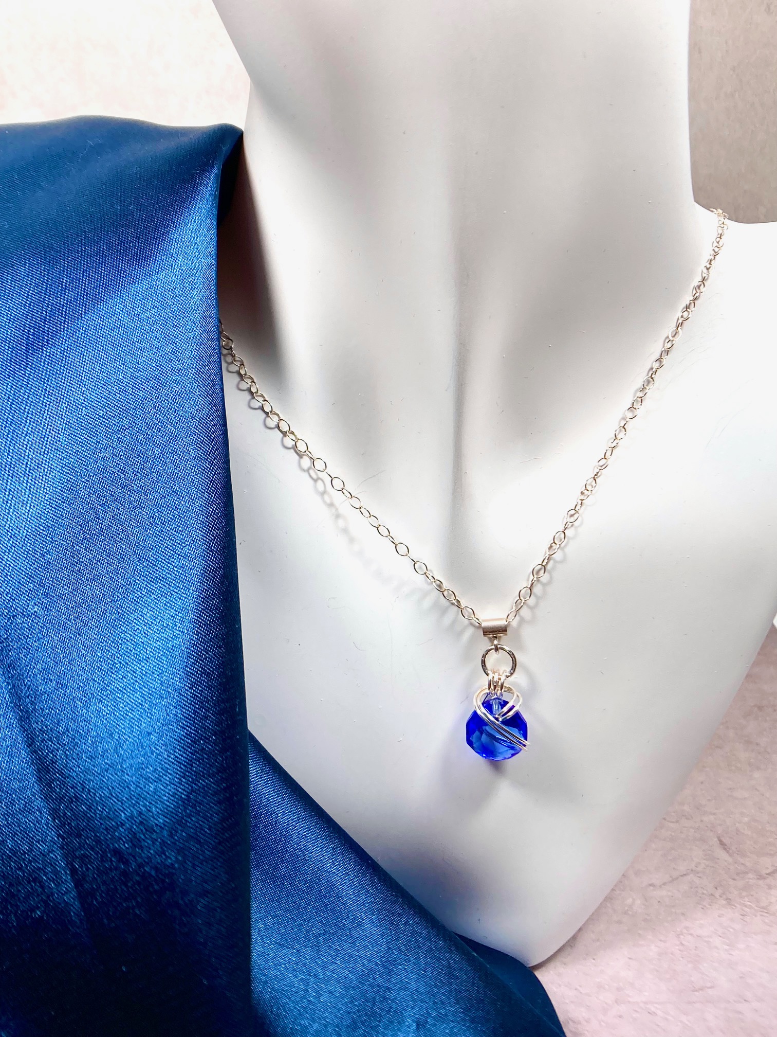 Sterling Silver Wire Wrapped Pendant necklace in Deep Blue Crystal, mounted on a Sterling Silver tube bead. Sterling Silver chain is cable style with a lobster claw clasp, and is 18 inches in length.